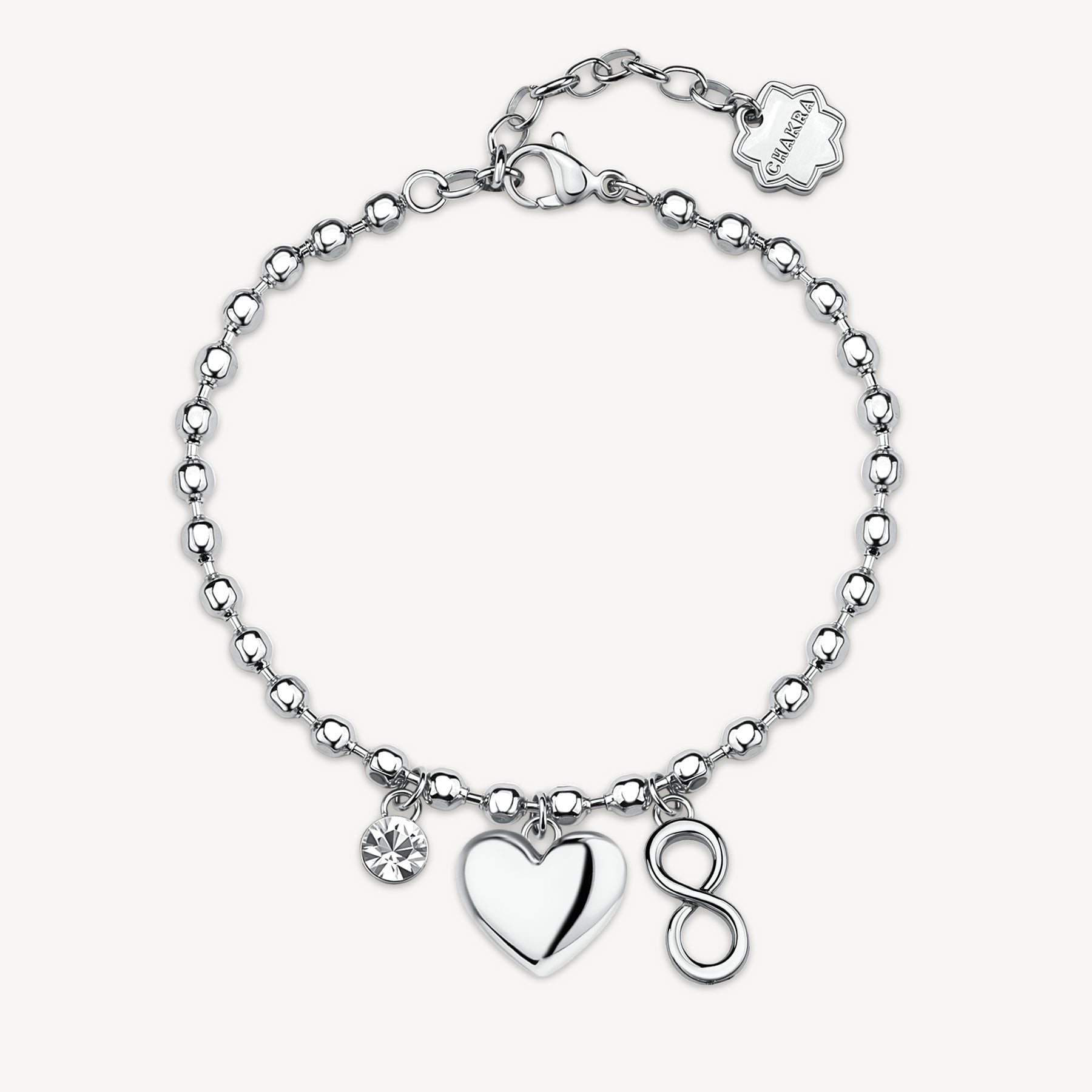 Bracciale in acciaio 316L con pendenti a forma di cuore, infinito e cristallo.