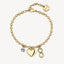 Bracciale in acciaio 316L e finitura pvd oro 14K, con pendenti a forma di cuore, infinito e cristallo.