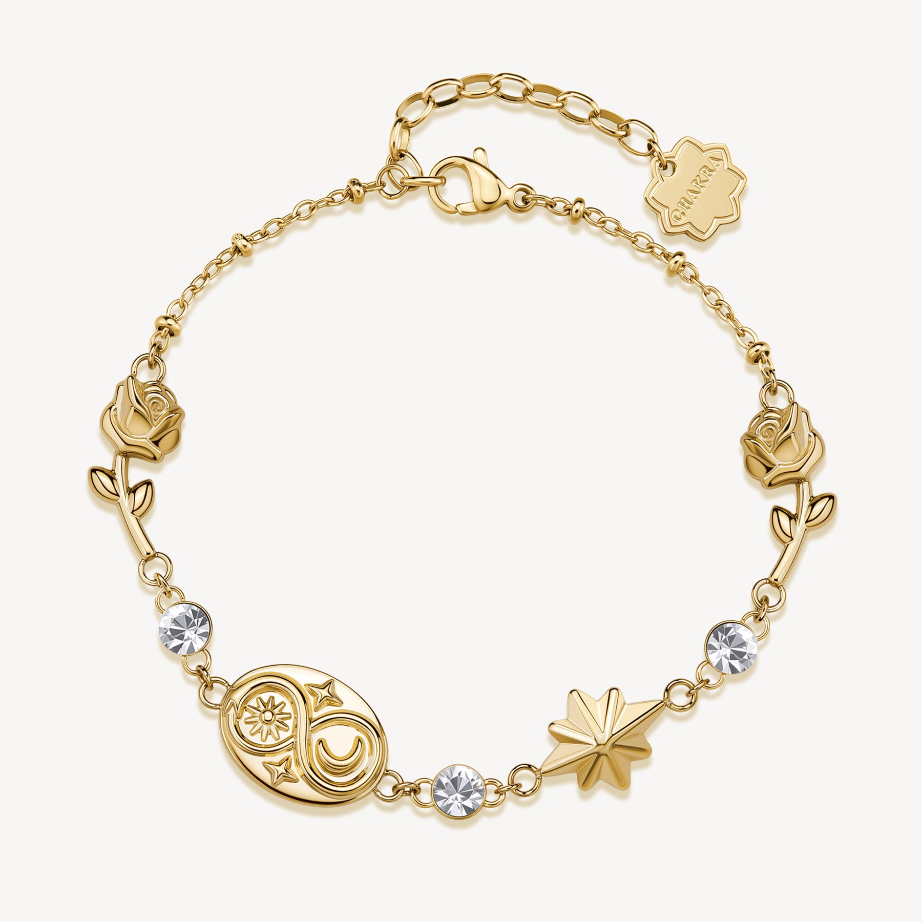 Bracciale in acciaio 316L con rosa, rosa dei venti, serpente e cristalli.