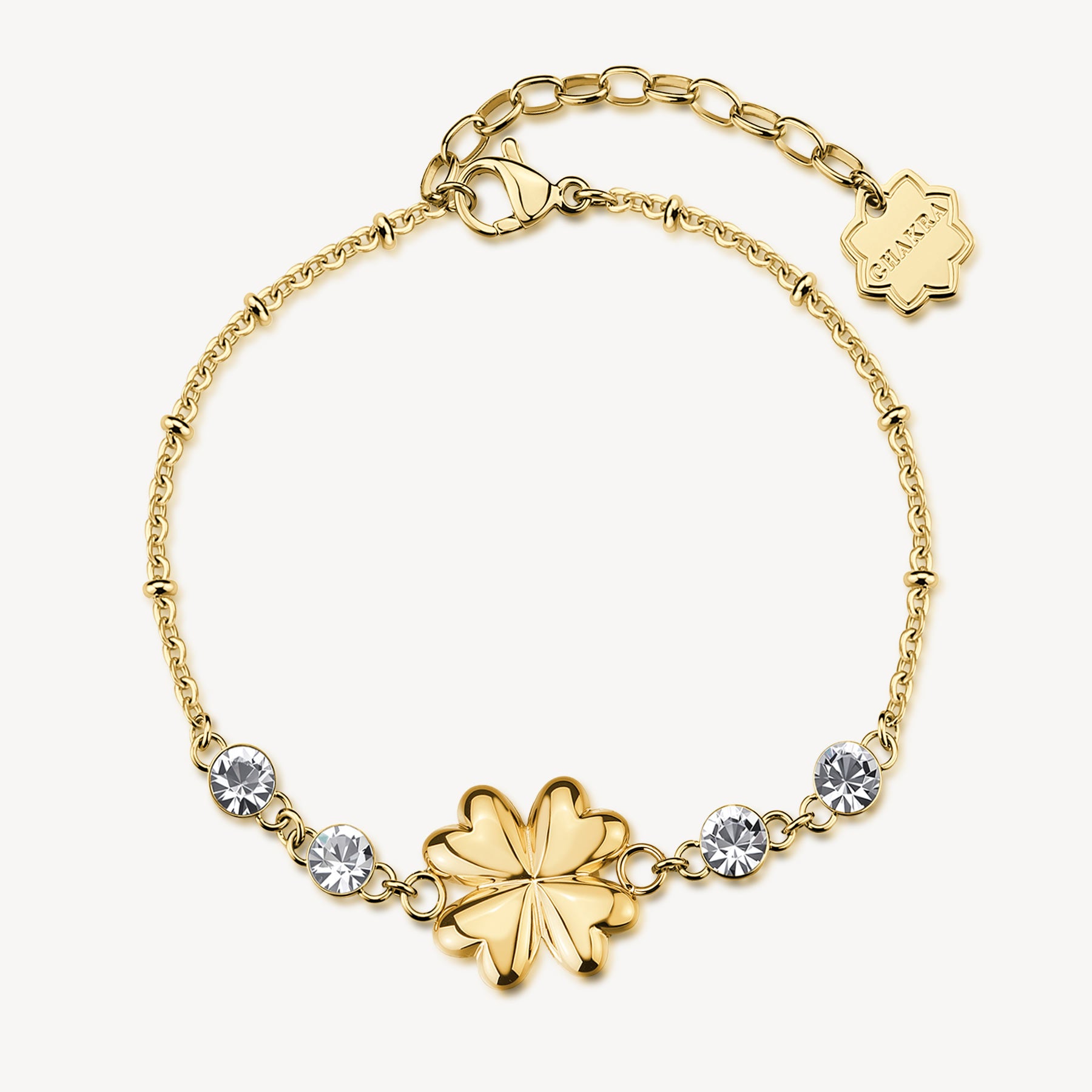 Bracciale in acciaio 316L e finitura pvd oro 14K, con quadrifoglio centrale e cristalli.
