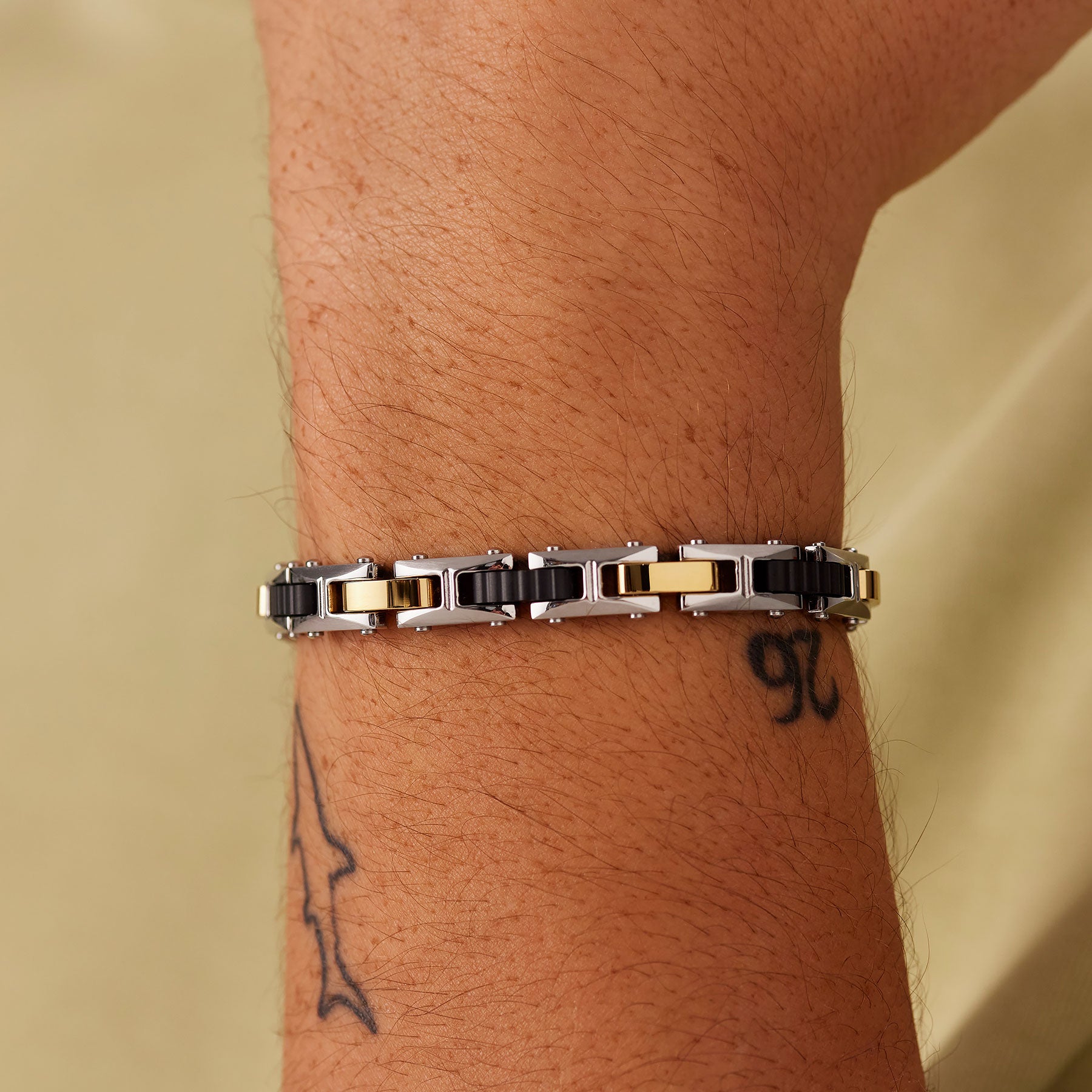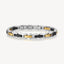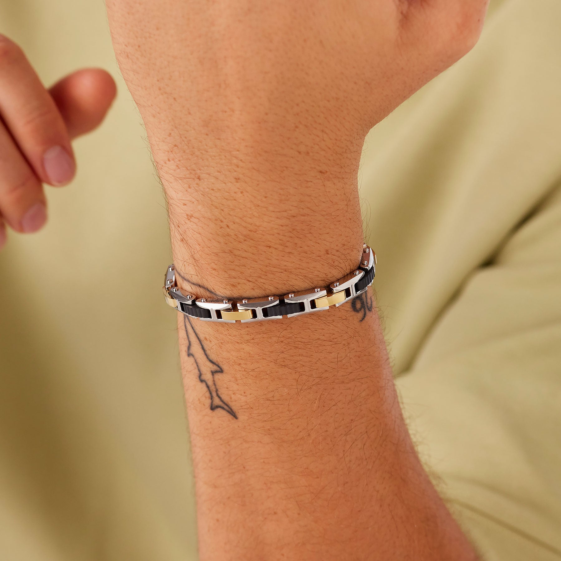 Bracciale in acciaio 316L e finitura pvd colore rutenio e finitura pvd oro 14K.