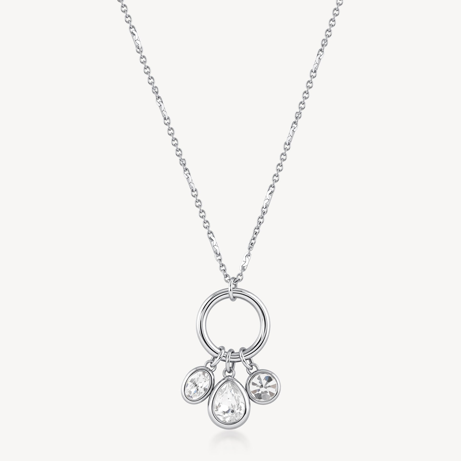 Collana in acciaio 316L con pendente centrale composto da cristalli a forma di goccia, ovale e tondo.