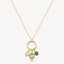 Collana in acciaio 316L e finitura pvd oro 14K con pendente centrale composto cristalli a forma di goccia, ovale e tondo nei colori bianco, erinite e chrysolite.