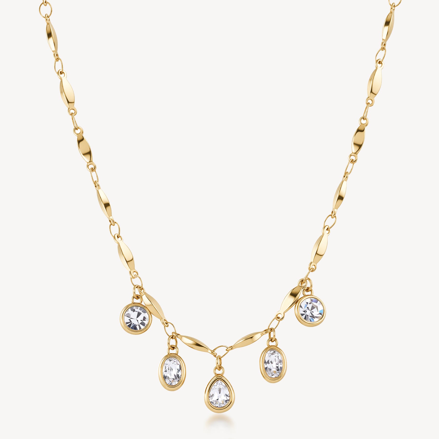 Collana in acciaio 316L e finitura pvd oro 14K e cristalli a forma di goccia, ovale e tondo.
