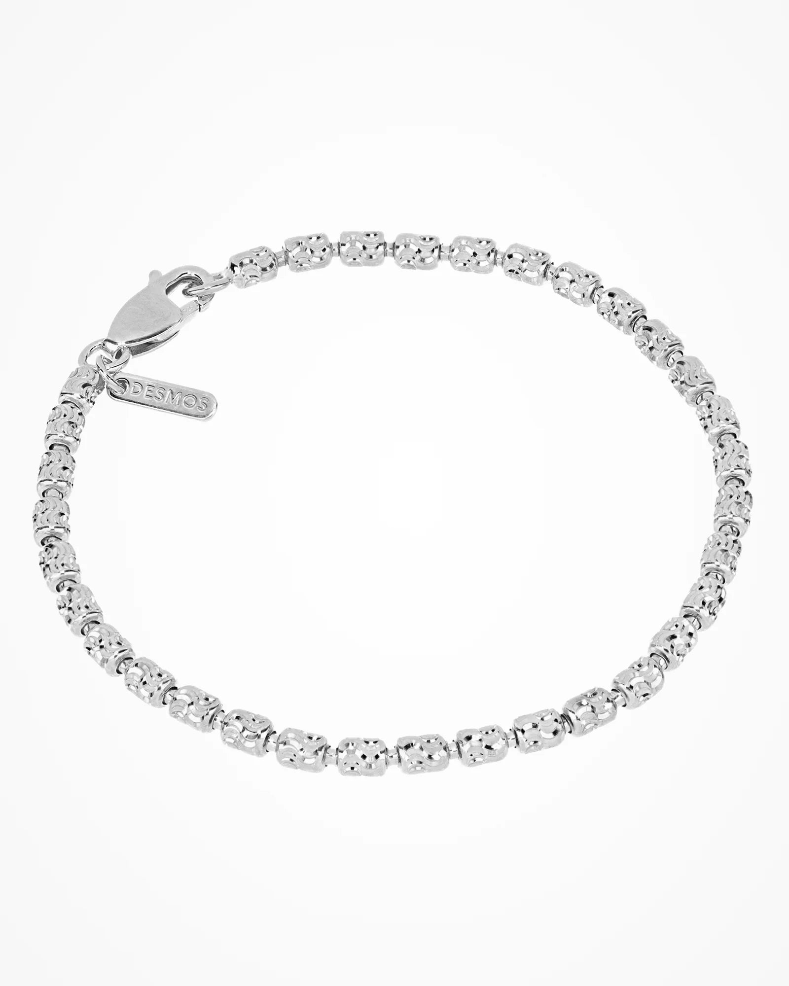 Bracciale in argento con sequenza di elementi cilindrici diamantati piccoli.