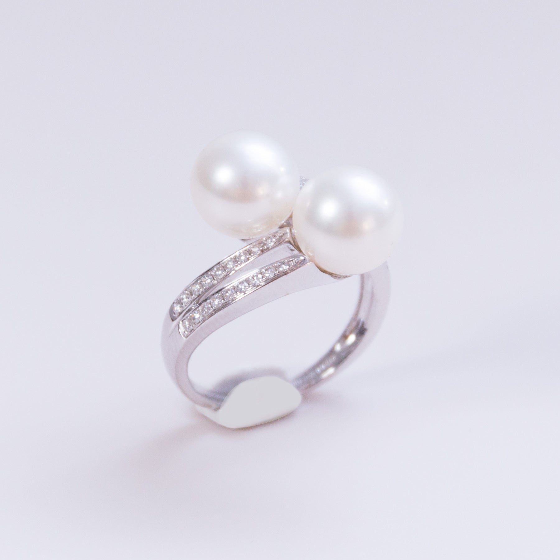 Anello in oro bianco con diamantini e due perle da 9mm. Ct. 0.22