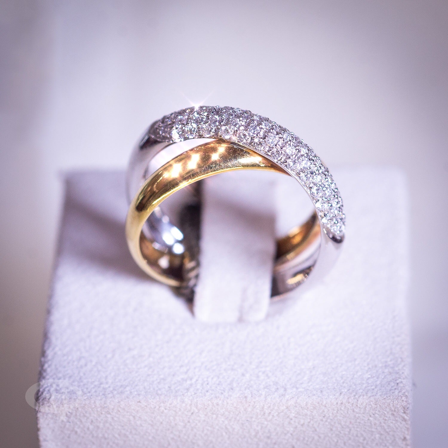 Anello in due ori 18 carati sovrapposti, bianco e giallo, con diamanti da 0.50 carati.