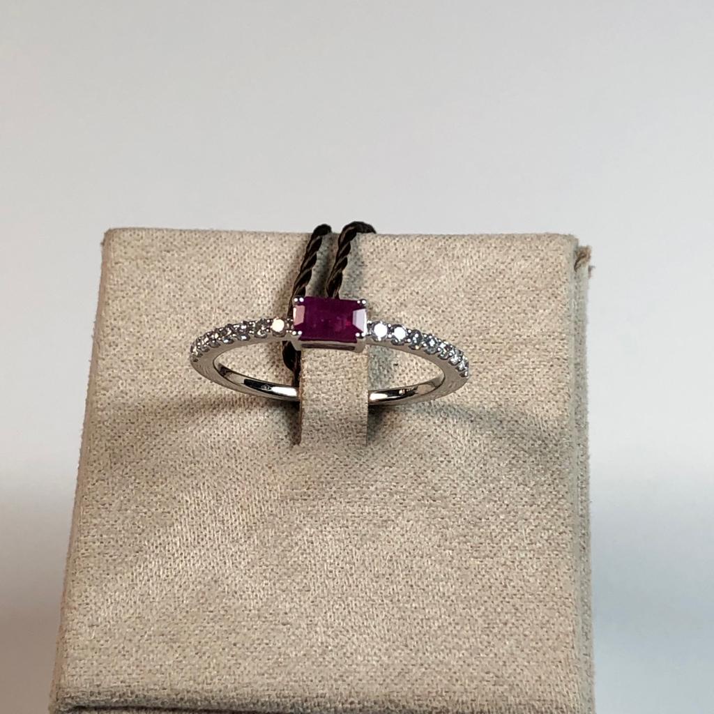 Anello in oro bianco 750 da 1,80 gr con rubino da 0,41 carati, e diamanti da 0,18 carati.