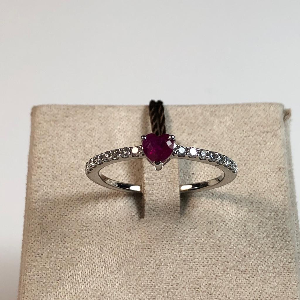 Anello in oro bianco 750 da 1,75 gr con rubino a forma di cuore da 0,29 carati, e diamanti da 0,18 carati.