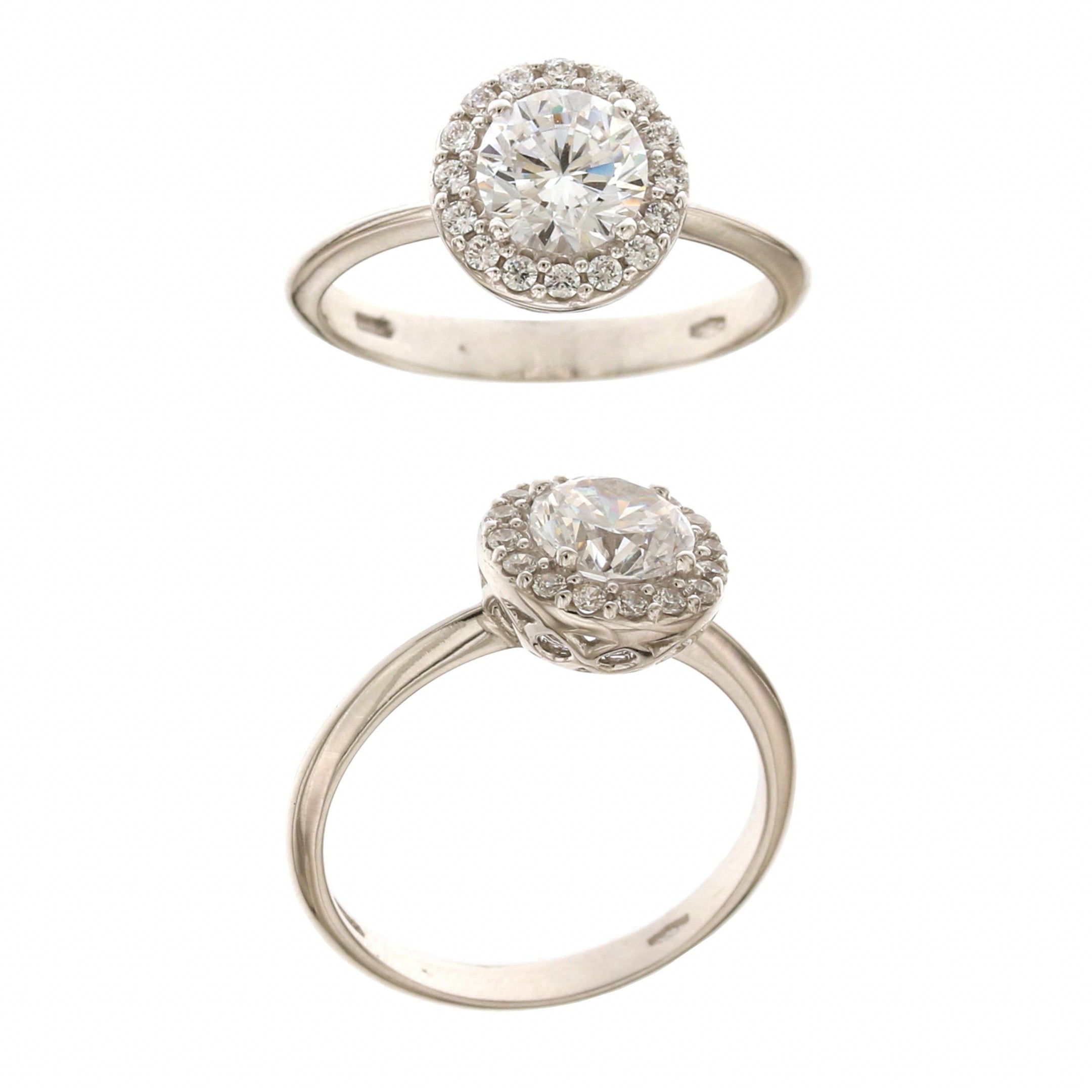Anello in oro bianco modello solitario, con cornice di zirconi, 3a misura – (15pt ) – altezza montatura cm0,60 – dm zircone centrale cm0,60