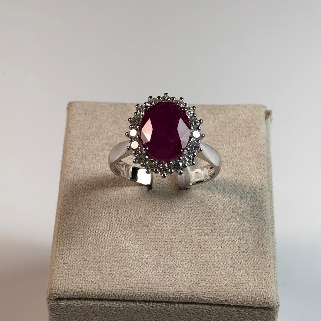 Anello in oro bianco 18 carati con diamantini da 0,60 carati e rubino da 2,89 carati.