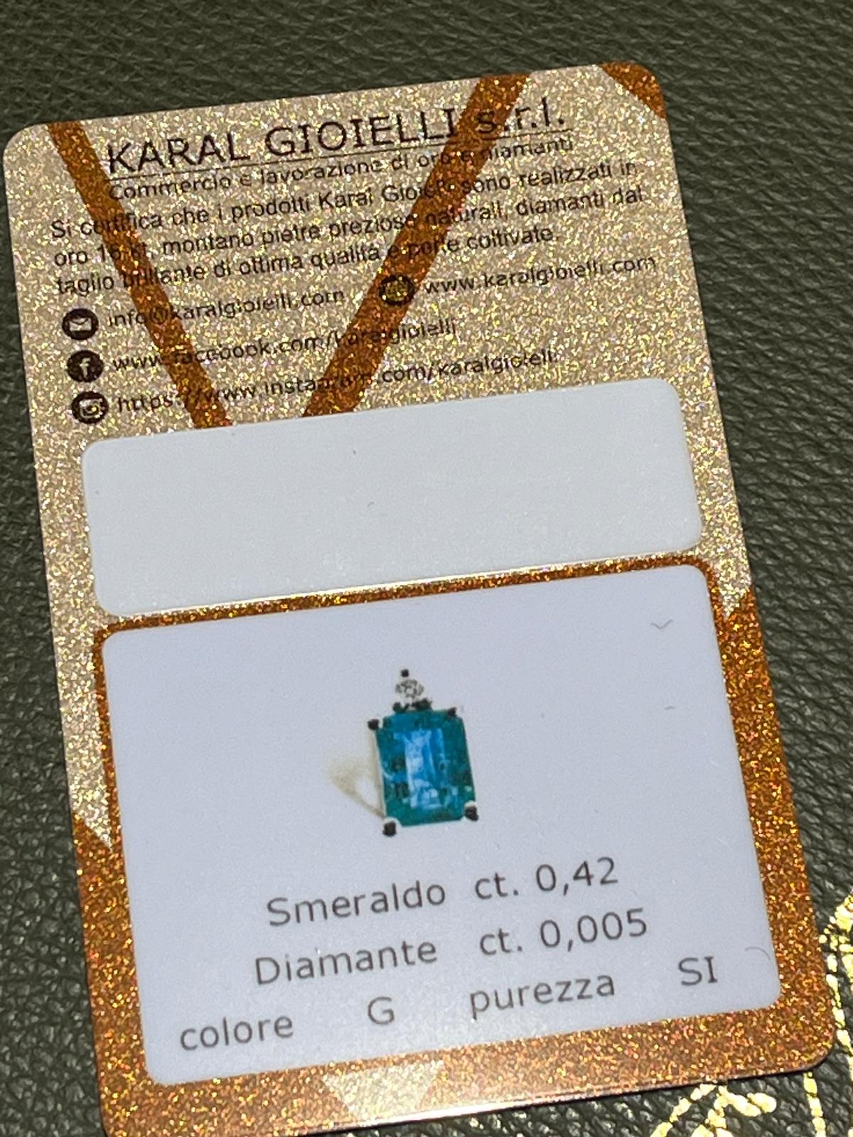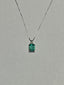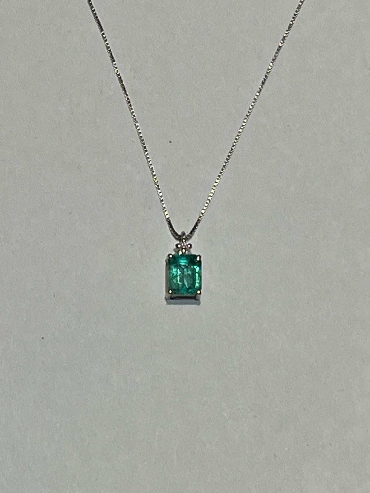 Collana in oro bianco 750%o - 18 carati con pendente avente uno splendido smeraldo naturale, taglio rettangolare da 0,42 carati ed un diamantino da 0,005 carati, taglio brillante, di colore G e purezza SI.