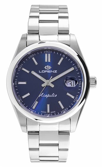 La collezione Acapulco di Lorenz è un omaggio alla celebre località messicana, simbolo di glamour, spiagge esclusive e vita notturna raffinata. Pensata per chi ama distinguersi con stile, questa linea iconica unisce design sportivo ed eleganza classica. Il modello presenta una cassa in acciaio massiccio da 39 mm con lunetta zigrinata o liscia, abbinata a un raffinato bracciale acciaio. Il vetro zaffiro con lente garantisce massima leggibilità del datario posizionato a ore 3, mentre il fondello e la corona a vite assicurano un'impermeabilità fino a 100 metri. Al suo interno batte un affidabile movimento al quarzo "swiss made", una garanzia di precisione svizzera. Il bracciale solido con chiusura a doppio pulsante completa l'esperienza, offrendo comfort e sicurezza al polso. Un orologio pensato per chi ama l'eleganza sportiva e vuole lasciare il segno, in ogni occasione.