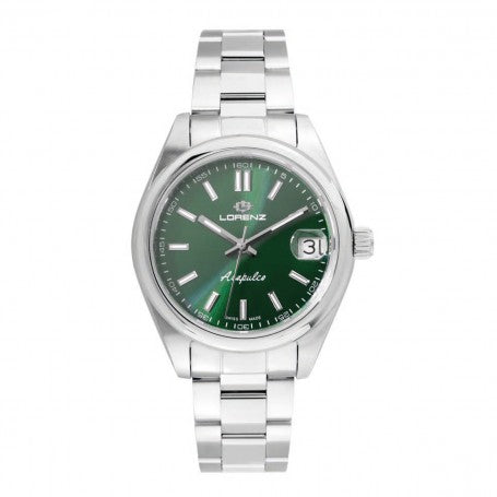 Orologio con movimento al quarzo Ronda 515-3 Swiss Made. Cassa in acciaio diametro 34 mm. Spessore cassa 11 mm. Fondello in acciaio serrato a vite. Vetro zaffiro. Quadrante verde. Cinturino in acciaio con chiusura deployante, lunghezza 18 cm, larghezza anse 2 cm. Datario con giorno del mese a ore 3 con lente. Water Resistant 10 Atm.