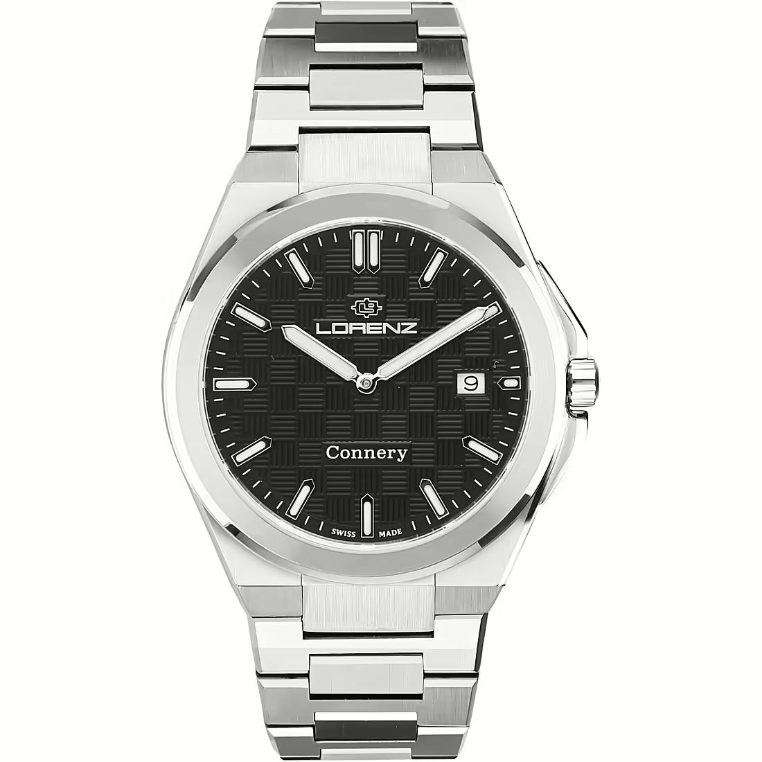 Orologio solo tempo da uomo della collezione Connery. Cassa in acciaio, rotonda del diametro di 40 mm. Quadrante di colore nero index. Orologio due sfere data con cinturino in bracciale in acciaio integrato, chisura a scomparsa con doppio pulsante. Misura anse: 23 mm. Lunghezza cinturino: 18 cm. Movimento: Ronda 714. Datario:SI. La resistenza all'acqua è di 7 ATM. Dettagli specifiche: extrapiatto, astuccio speciale connery