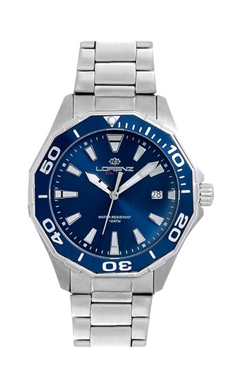 Orologio marca Lorenz con cassa e bracciale in acciaio, movimento al quarzo, quadrante blu con indici e sfere lumibrite, vetro cristal k1, ghiera girevole laccata di blu, corona a vite wr 10 atm.
