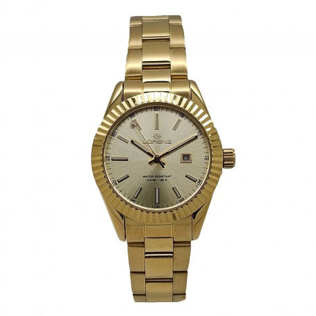 Orologio con movimento al quarzo Japan Made. Cassa in acciaio IP Gold diametro 32 mm. Spessore cassa 10 mm. Fondo in acciaio serrato a pressione. Vetro minerale. Corona di regolazione in acciaio serrata a pressione. Ghiera in acciaio IP Gold. Quadrante dorato. Cinturino in acciaio IP Gold con chiusura deployante. Datario giorno del mese a ore 3. Water Resistant 5 Atm.