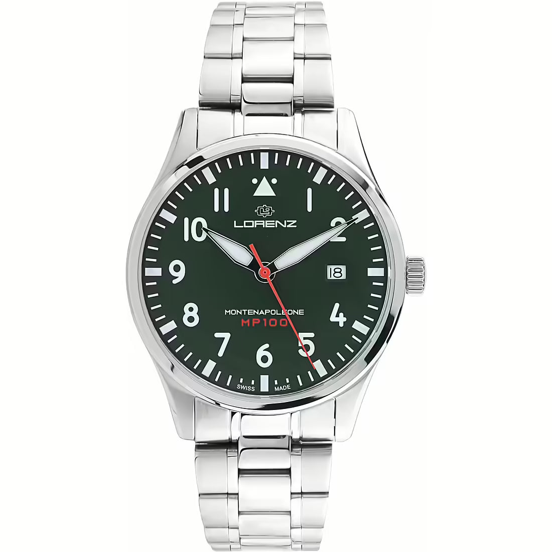 Orologio solo tempo da uomo della collezione Montenapoleone MP100. Cassa in acciaio, rotonda del diametro di 40 mm. Quadrante di colore verde arabe. Orologio quarzo 3 sfere, data a ore 3 con cinturino in pelle verde con ardiglione. Misura anse: 20 mm. Lunghezza cinturino: 19 cm. Movimento: quarzo, Ronda 718. Datario:SI. La resistenza all'acqua è di 5 ATM. L'orologio è perosnalizzabile sul retro della cassa. La referenza è 090004LL