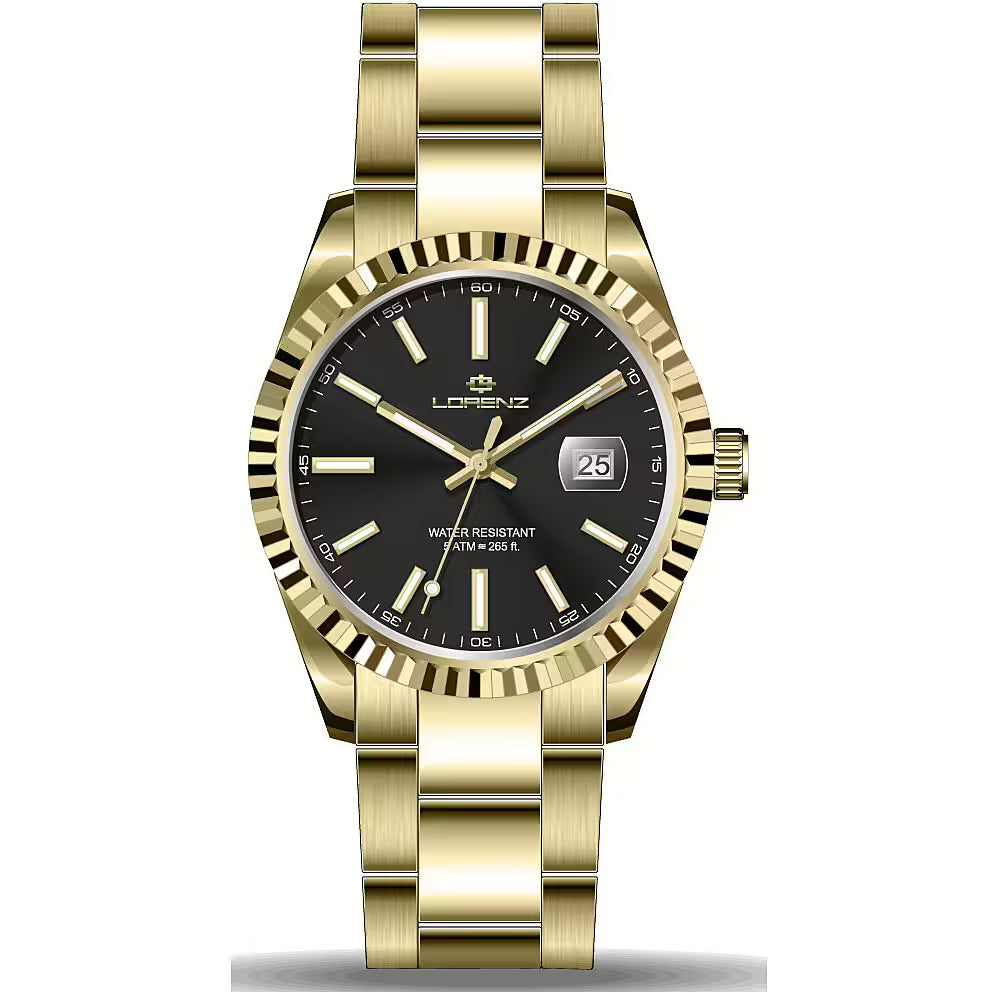 Orologio da uomo solotempo di Lorenz. Orologio con cassa in acciaio di forma rotonda, dal diametro della cassa: 40 mm con indici applicati. Orologio con bracciale in acciaio e movimento al quarzo, la resitenza all'acqua è di 5 atm. La refernza è: LZ 28187GG