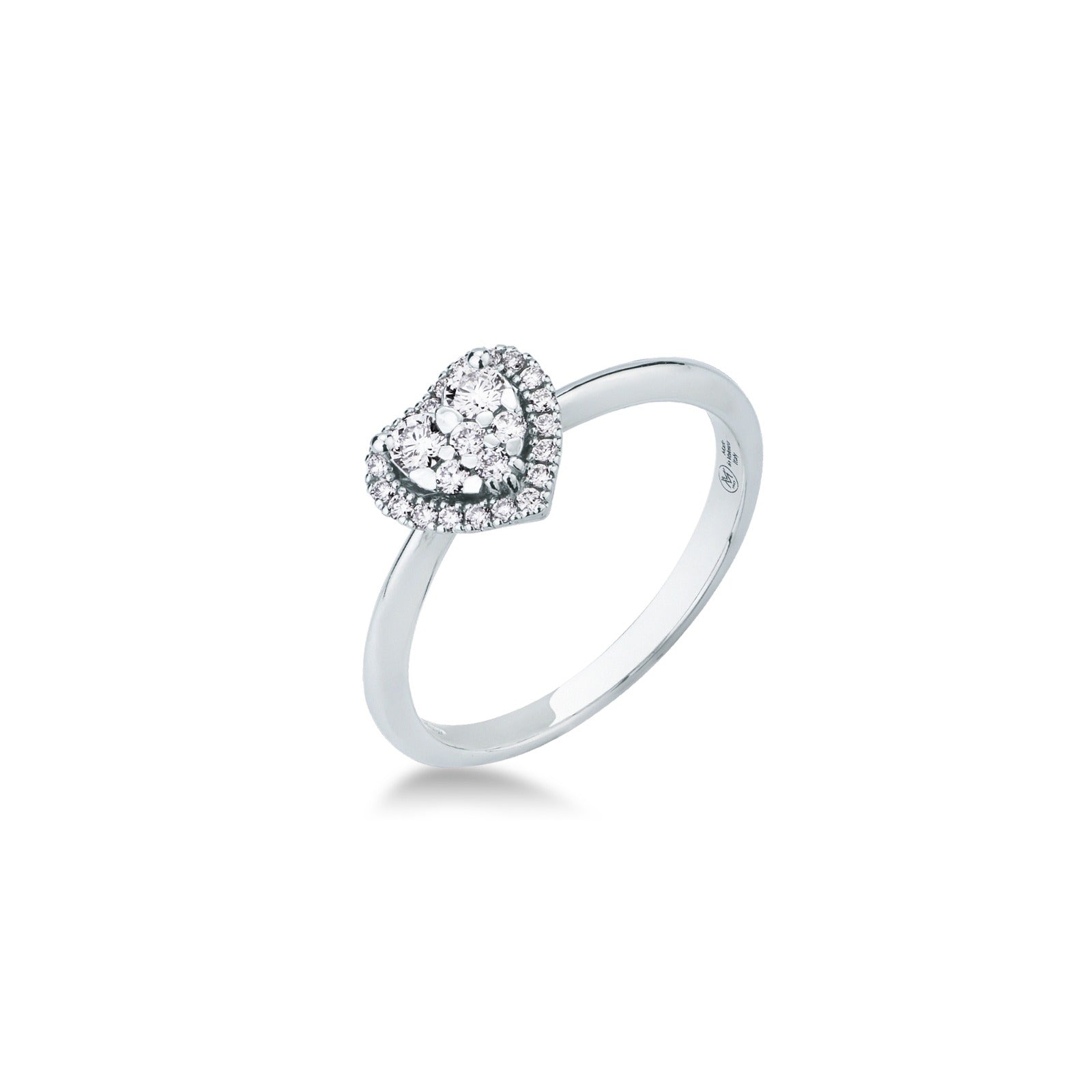 Un raffinato anello in oro bianco 18kt, caratterizzato da un elegante design a cuore impreziosito da un pavé di diamanti. Il centrale a forma di cuore dona romanticismo e luminosità, mentre la montatura sottile valorizza la brillantezza delle pietre, creando un gioiello femminile, elegante e perfetto come regalo significativo.