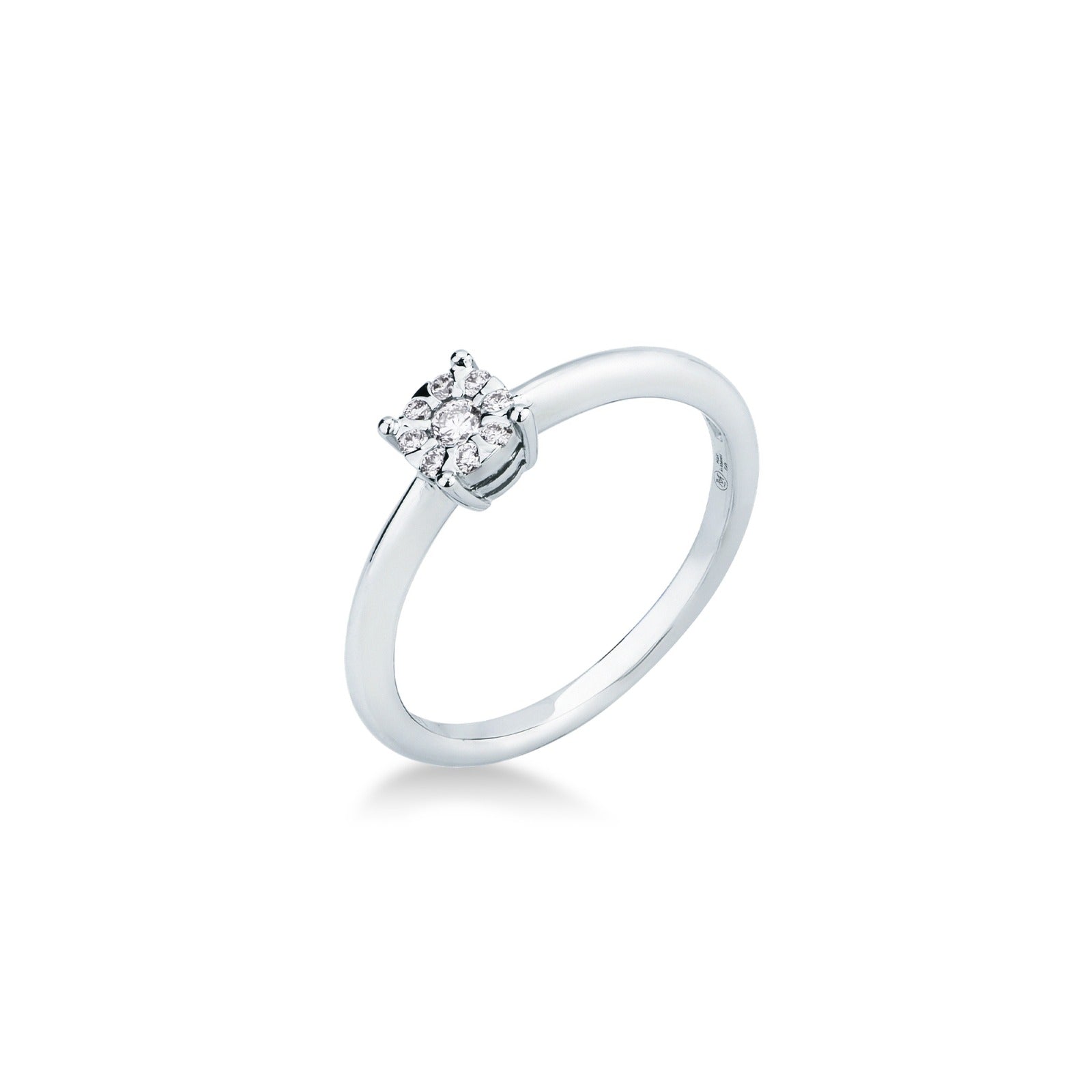 Anello in oro bianco 18 kt con diamanti taglio brillante per un totale di 0.12 ct (colore G, purezza VS). Un gioiello raffinato e luminoso, perfetto per chi desidera un’eleganza sobria e senza tempo.