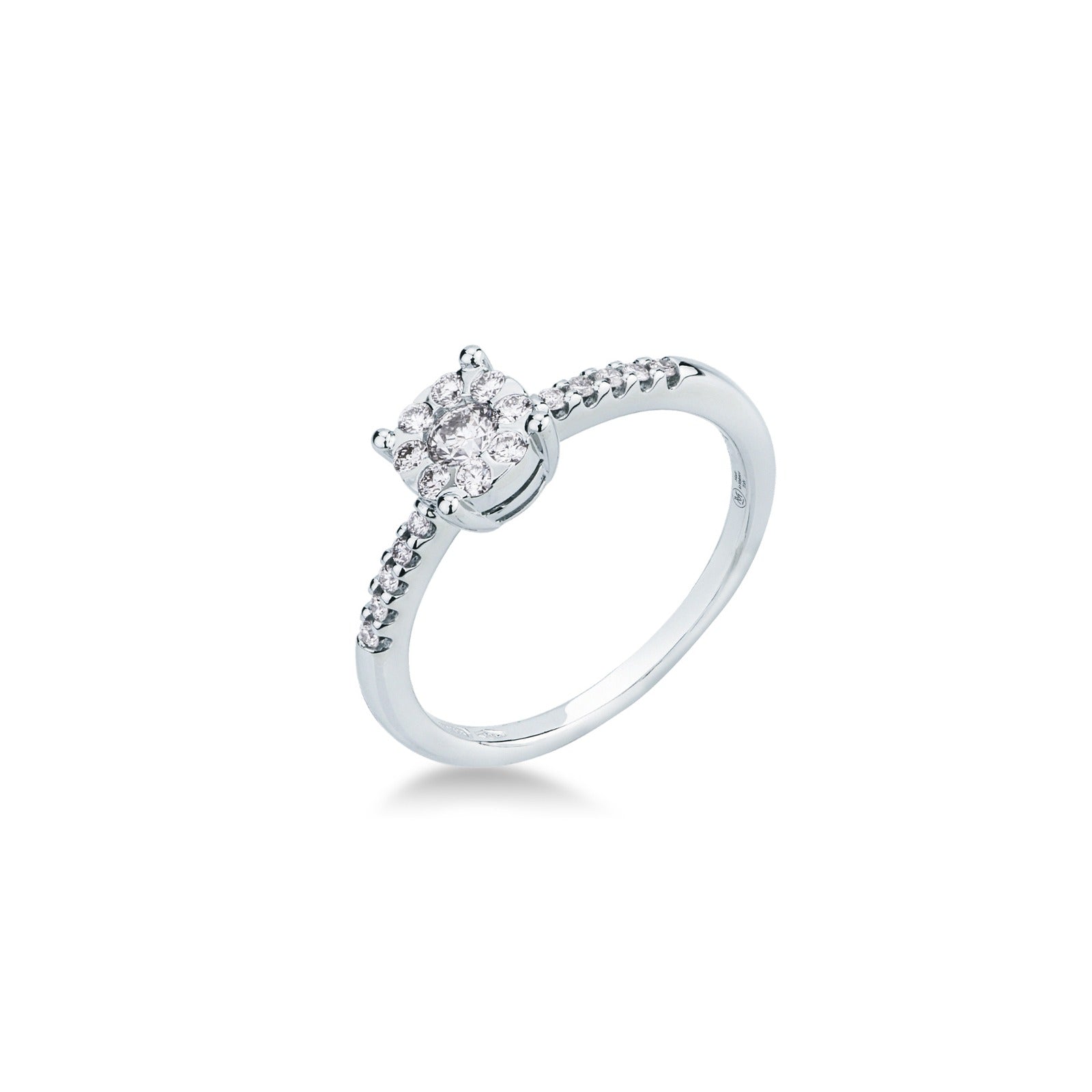 Anello in oro bianco 18 kt impreziosito da diamanti taglio brillante per un totale di 0.35 ct (colore G, purezza VS). Un gioiello di grande luminosità, simbolo di eleganza e perfezione, ideale per celebrare i momenti più preziosi.