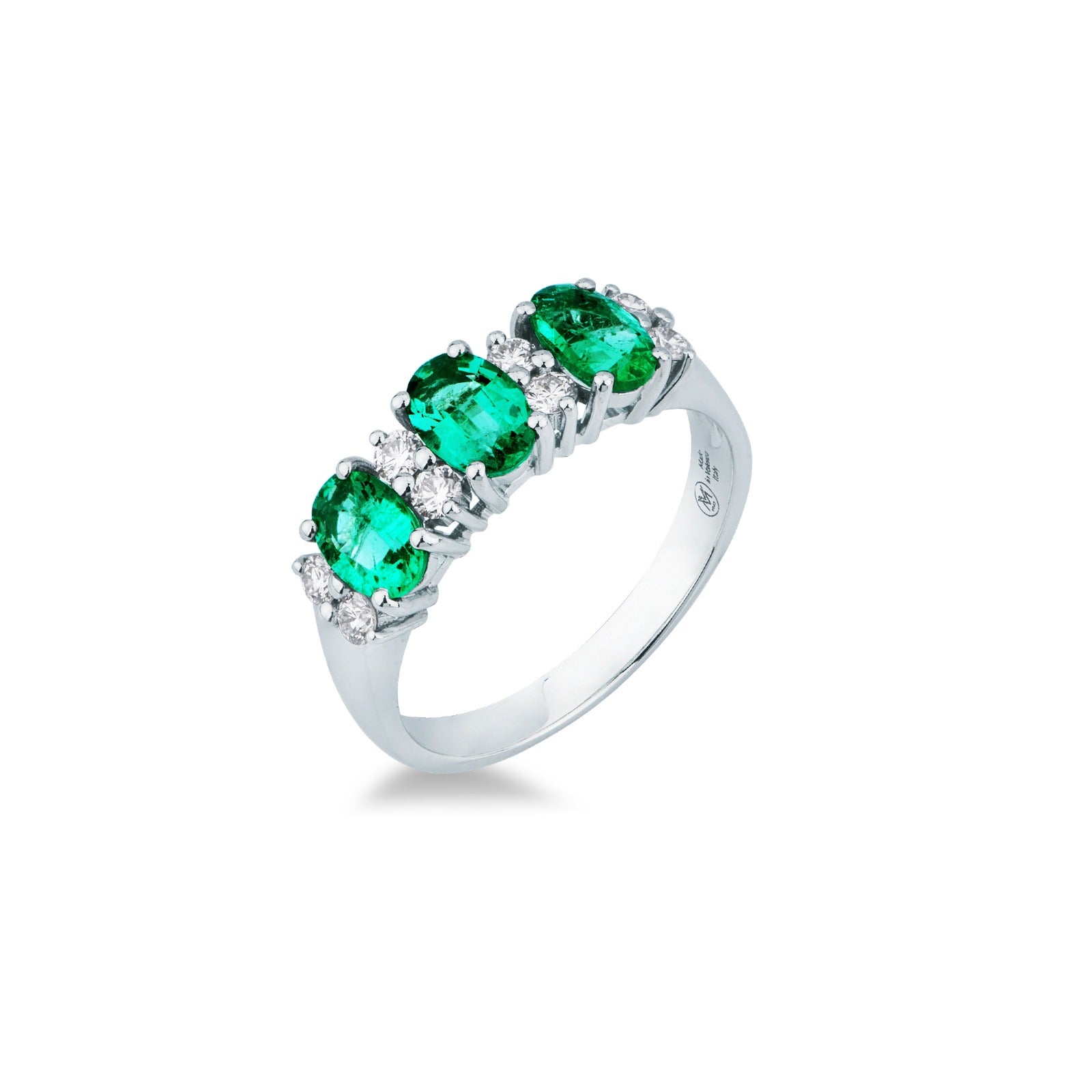 Anello in oro bianco 18 kt impreziosito da smeraldi dello Zambia per un totale di 1.47 ct e diamanti taglio brillante (0.26 ct, colore G, purezza VS). Un gioiello dal fascino raffinato e luminoso, che unisce il verde intenso dello smeraldo alla purezza del diamante.