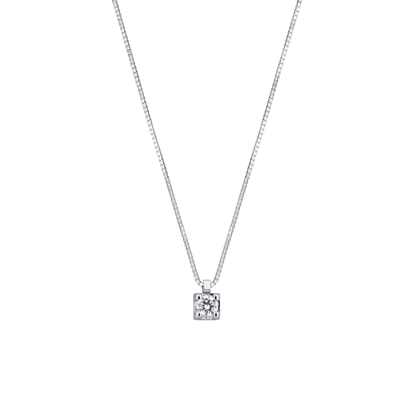 Collana in oro bianco 18 kt con diamante taglio brillante da 0.11 ct (colore F, purezza VS). Un punto luce elegante e luminoso, pensato per valorizzare ogni look con un tocco raffinato e senza tempo. Perfetta da indossare ogni giorno o da regalare per un’occasione speciale.