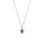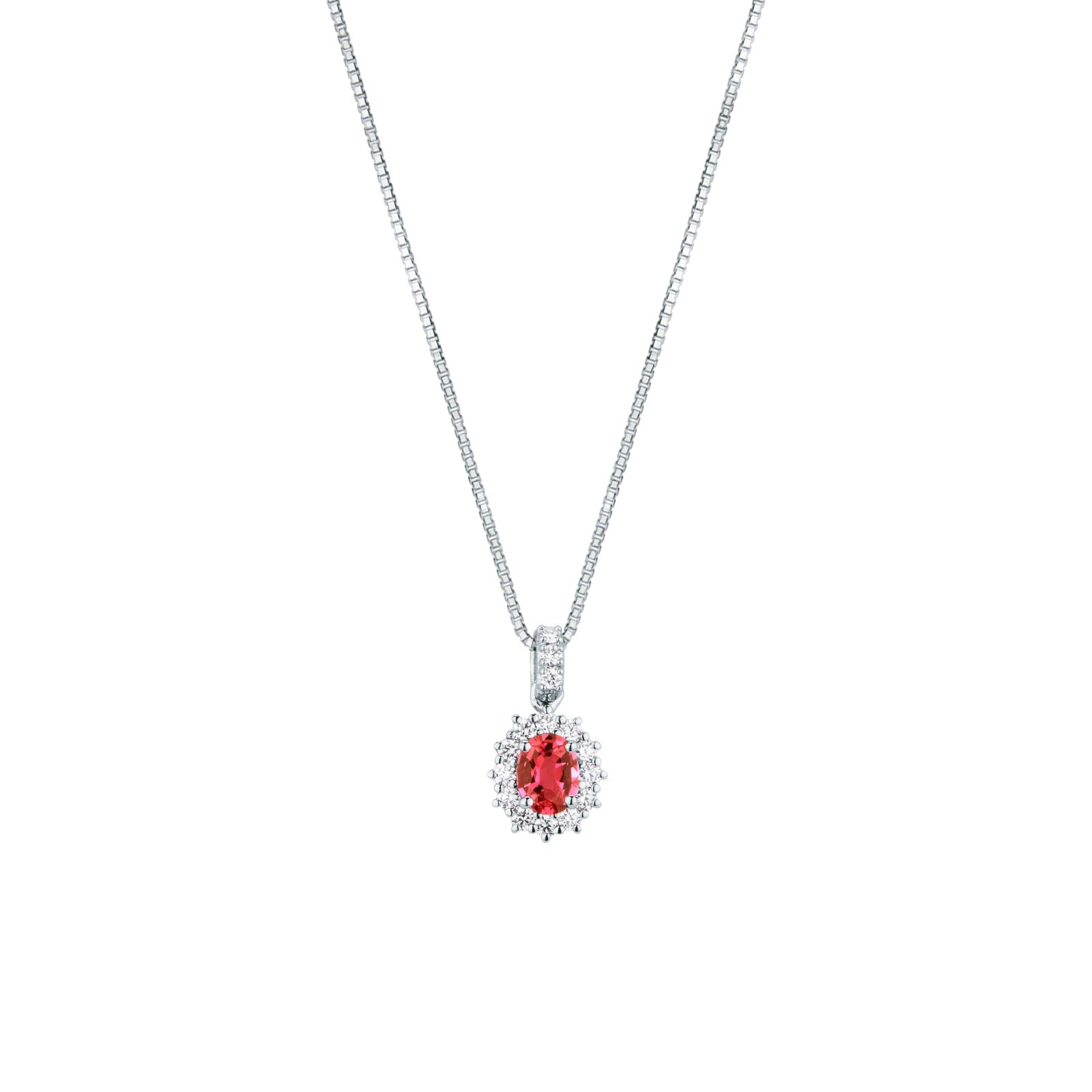 Elegante ciondolo in oro bianco 18kt con rubino naturale dal taglio ovale (Mozambico) impreziosito da un raffinato contorno di diamanti taglio brillante. Un gioiello luminoso, femminile e sofisticato, perfetto per donare un tocco di colore prezioso a ogni look.