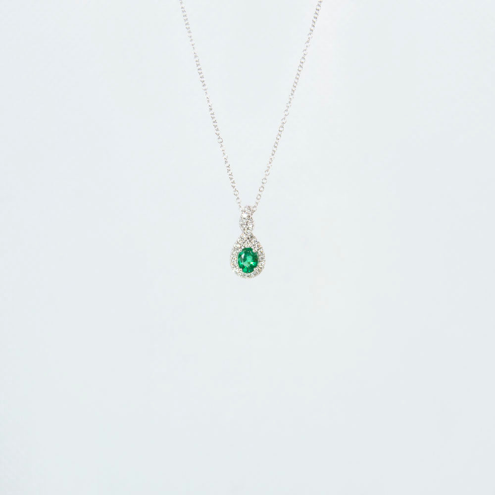 Collana in oro bianco 750 da 3,00 grammi con smeraldo colombiano da 0,26 carati e diamanti G-VS da 0,15 carati.