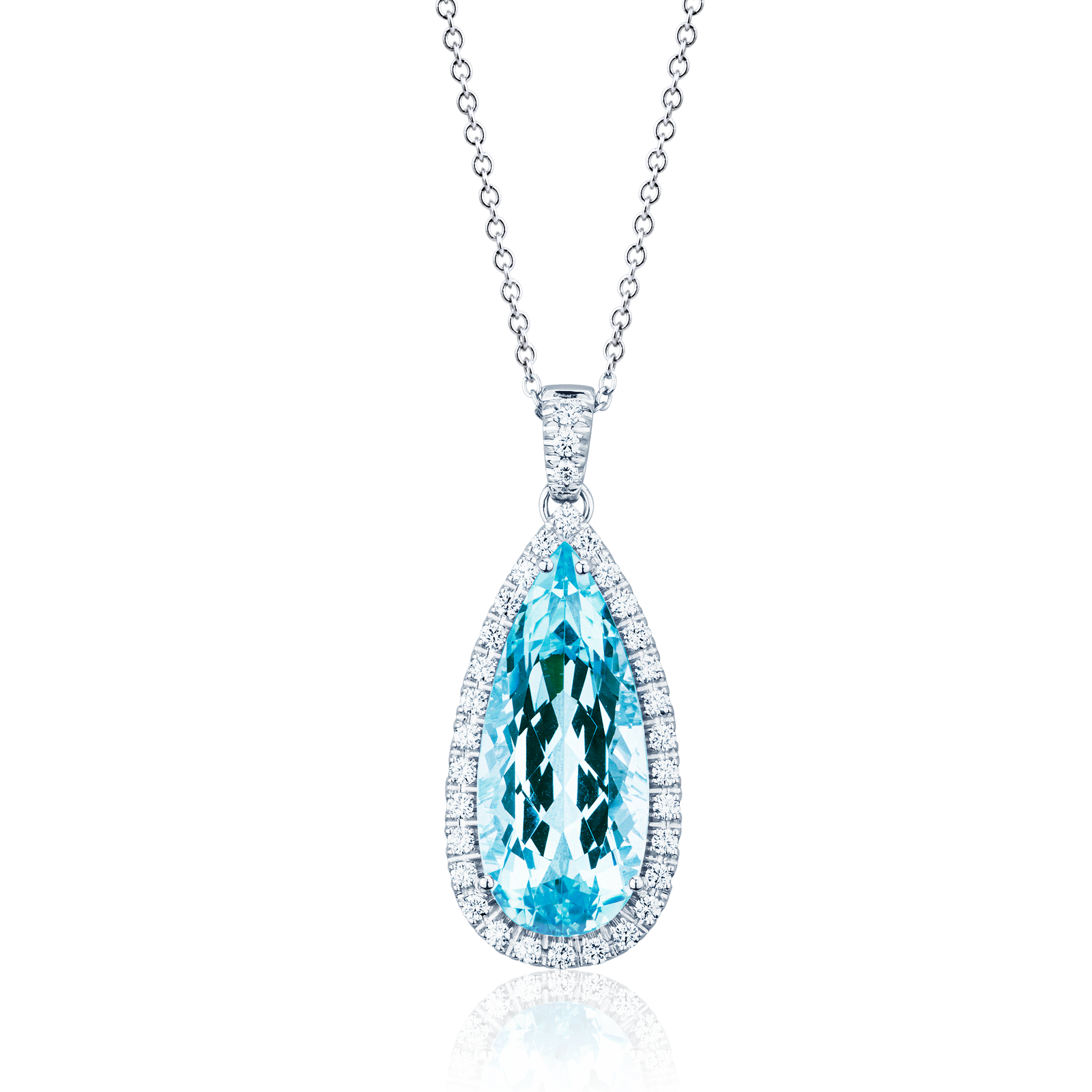 Collana in oro bianco 18 carati modello rolò arricchita da diamanti, presenta un pendente a forma di goccia composto da un' acquamarina centrale da ct 11,11 contornata da diamanti taglio brillante G VS per ct 0,91