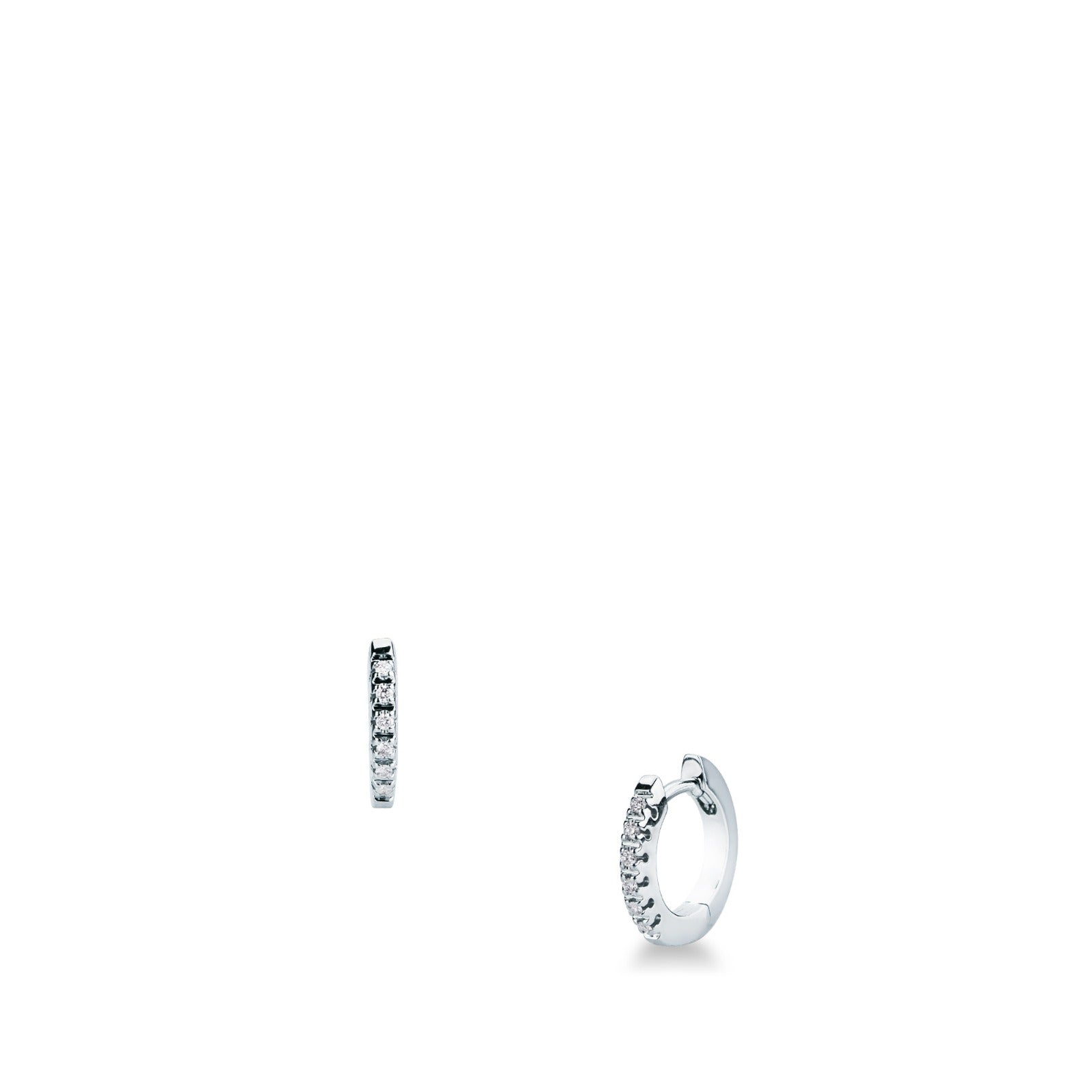 Eleganti cerchietti in oro bianco 18 kt con diamanti taglio brillante per un totale di 0.08 ct per orecchino, colore G e purezza VS. Un design sottile e luminoso, perfetto per un look raffinato e quotidiano.