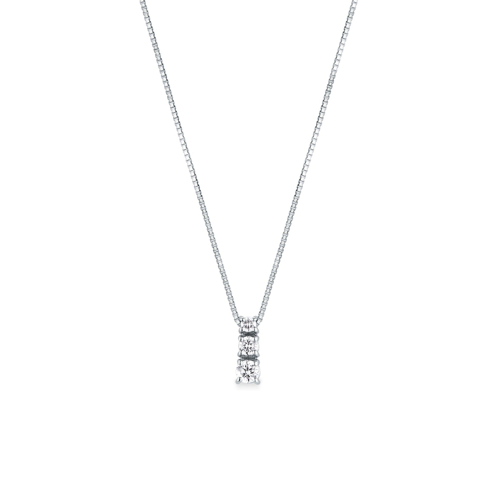 Collana in oro bianco 18 kt con pendente lineare impreziosito da diamanti taglio brillante di qualità F/VS. Il design essenziale ma luminoso valorizza ogni outfit con un tocco raffinato e moderno. Perfetto come regalo elegante o come gioiello quotidiano da indossare sempre.