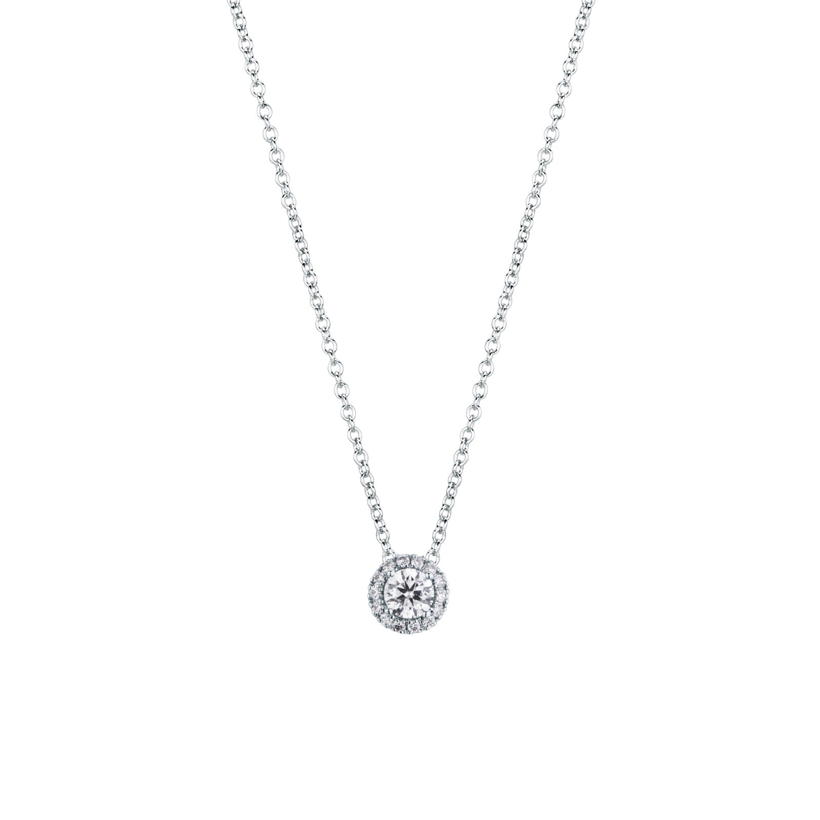Collana punto luce con diamante centrale e corona di brillanti a contorno (halo), realizzato in oro 18 kt. La combinazione dei diamanti F/VS crea un effetto di luminosità sorprendente e un look elegante e raffinato. Perfetto per chi desidera un gioiello che risalti e illumini il viso con delicatezza e brillantezza.
