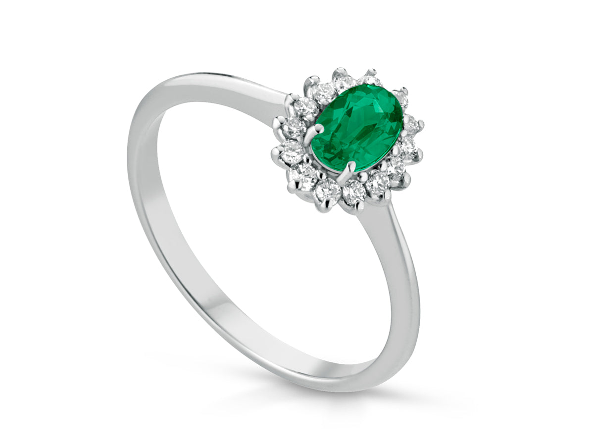 Questo anello elegante in oro bianco esalta la bellezza di un raffinato smeraldo ovale da 0,85 ct, luminoso e intenso nel suo colore verde. La gemma centrale è avvolta da un delicato e brillante contorno di diamanti naturali per un totale di 0,18 ct, colore G e purezza VS, che amplificano la luce e donano al gioiello un’eleganza senza tempo.