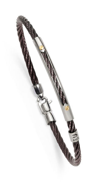 Bracciale con cavetto in acciaio brunito e viti in oro giallo.