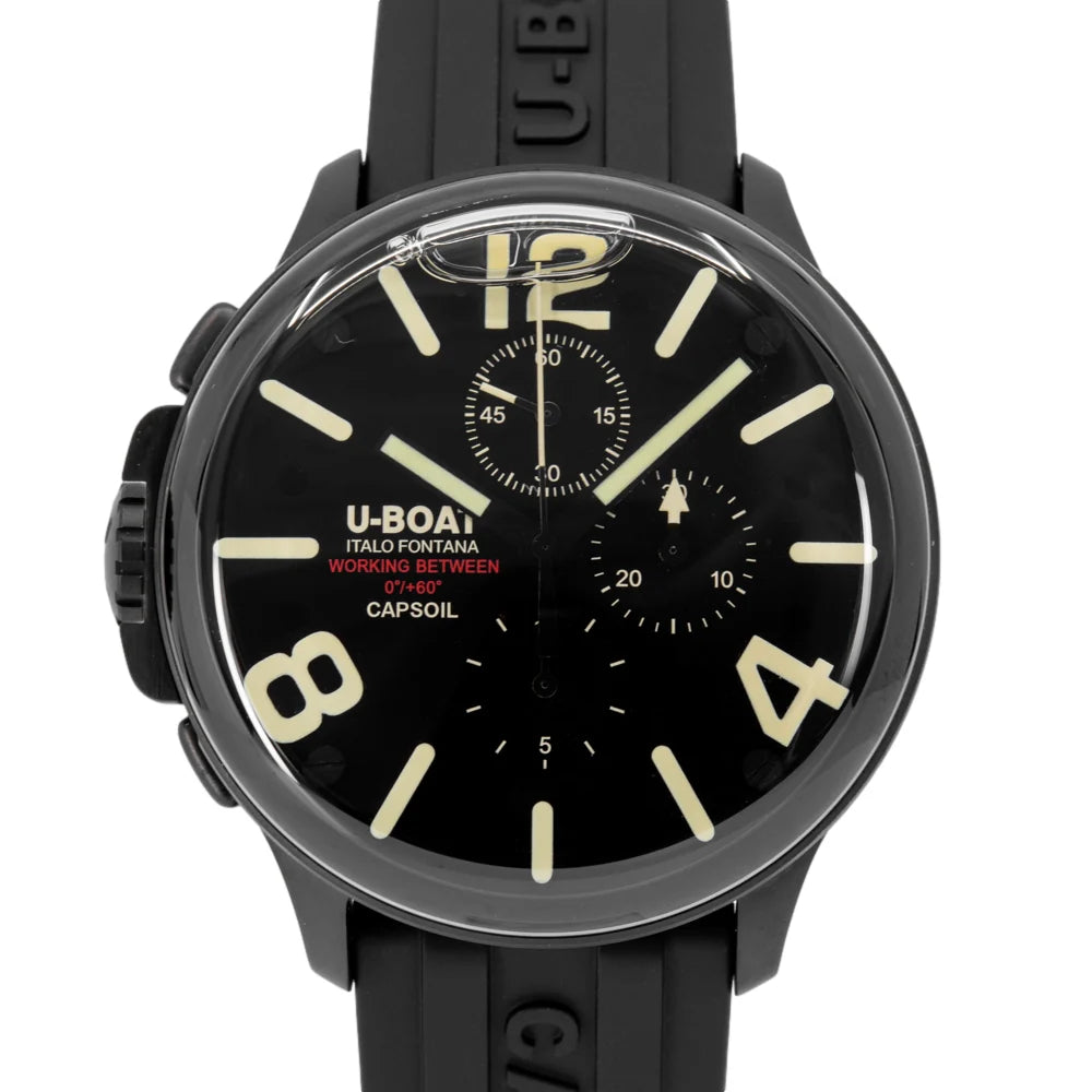 Altre funzioni Corona a sinistra, Altre funzioni Indici luminescenti, Altre funzioni Rivestimento PVD/DLC, Calibro oil bath, Categoria Orologeria, Chiusura Chiusura ad ardiglione, Collezione CAPSOIL, Colore quadrante Nero, Condizione 1 (nuovo), Dial color Black, Diametro 45, Funzioni orologio Cronografo, Garanzia 2 anni, Genere Uomo, Marchio U-Boat, Materiale cassa Acciaio, Movimento swiss electro-mechanical movement lubricated with oil bath, Numeri Numeri arabi, Origine ITALIA, Resistenza acqua 10 ATM, Categoria SOTTO Orologeria, Sottocategoria Orologeria, Vetro Vetro zaffiro