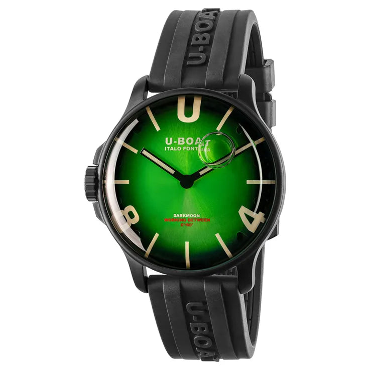 La collezione U-BOAT Darkmoon porta il design familiare Capsulo un passo oltre, verso lo spazio e il lato oscuro della luna. L’orologio U-BOAT Darkmoon 44 mm Green PVD Soleil 8698/C è dotato di un movimento Swiss-made Ronda 712.3, completamente immerso in olio a bassa viscosità, che dona al quadrante una sensazione di profondità e ne aumenta la luminosità, migliorandone la leggibilità.